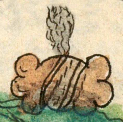 This compound glyph, featuring a stone that appears to be smoking ([iuhquin] popocatica tetl), is included in this digital collection for the purpose of making comparisons with related hieroglyphs. The term selected for this example comes from the text on the page before the image in the Digital Florentine Codex. There is no gloss, per se. This example shows a horizontal stone (tetl) with the classic curling ends and horizontal stripes and dotted lines across the middle. The stone sits on a blue-green ground. The gray smoke shoots upward (the verb, popoca, it smokes) with wavy lines that suggest movement.