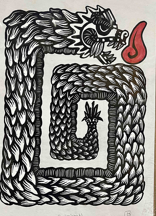The feathered serpent has had a long life as a theme in Mesoamerican art. Here is a contemporary print of “Quetzalcoatl” (the feathered serpent creator deity) in the Subterráneos workshop in Jalatlaco, Oaxaca. The stepped-fret shape also dates back to Aztec times, as does the red speech scroll outside the serpent’s mouth. Photograph by Stephanie Wood, 23 January 2026.