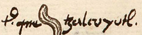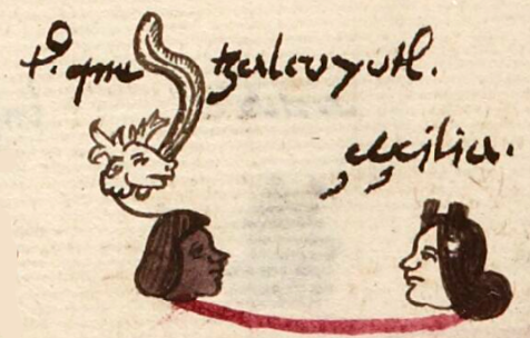This compound Nahuatl hieroglyph is a black-line drawing of the personal name Quetzalcoyotl (“Quetzal Feather-Coyote”), which is attested here as a man’s name. It shows a vertical, curving quetzal feather (quetzalli), and below that, the head of what is supposed to be a coyote (coyotl) in profile, facing right. This animal has what appear to be horns or antlers, which are not appropriate for a coyote. But the gloss makes it clear that coyotl is the intention. A very similar Quetzalcoyotl glyph with the same gloss appears in this same manuscript on folio 46 recto, and that coyote also has antlers.