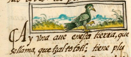 This iconographic example, featuring a quetzal bird (quetzaltototl), is included in this digital collection for the purpose of making comparisons with related hieroglyphs. The term selected for this example comes from the Nahuatl text near the image in the Digital Florentine Codex. There is no gloss, per se. This example shows a blue-green bird in profile, walking forward, facing the viewer’s right. Its left foot is in the air. It has short feathers standing up on the top of its head. Its tail feathers are somewhat long. The bird is set in a landscape, which shows European artistic influences.