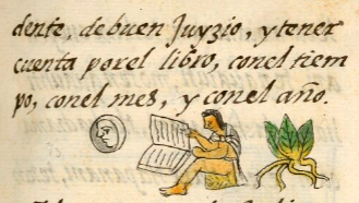 The book in this example appears to have lines of alphabetic writing (albeit heavily stylized) more than any hieroglyphic text, with particularly nothing like the tonalpohualli examples, below. But it is rather delightful that the horticulturalist is depicted and described as an avid reader and educated by books, especially about the seasons.