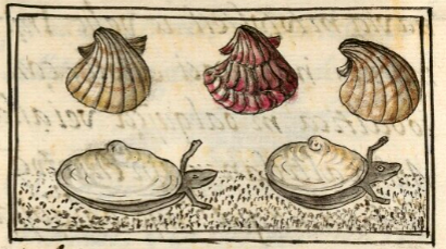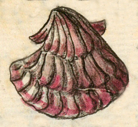 This iconographic example, featuring a Vogde’s scallop (tapachtli), is included in this digital collection for the purpose of making comparisons with related hieroglyphs. The term selected for this example comes from the text near the image in the Digital Florentine Codex. There is no gloss, per se. This example shows a view of the outside of the scallop shell. This one is pink, but the contextualizing image shows two more that are white with faintly pink stripes that run perpendicular to the natural ridges of the shell. The use of three-dimensionality here suggests European artistic influence in the tlacuilo.