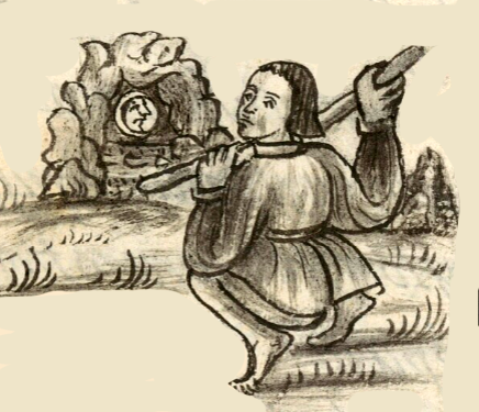 This iconographic example, featuring the verb to excavate (tataca), is included in this digital collection for the purpose of making comparisons with related hieroglyphs. The term selected for this example comes from the text near the image in the Digital Florentine Codex. There is no gloss, per se. This example shows a Nahua man excavating a cave to extract lead (temetztli) ore. A simplex hieroglyph in the cave, showing a moon (metztli), stands for temetztli, its near homophone and associated with the color and/or shine of lead. The moon consists of the face of a man in profile, looking toward the right. The cave (oztotl) is drawn here more like a landscape sketch than a hieroglyph, and the surrounding hill or mountain (tepetl) is not drawn much like a hieroglyph, either.