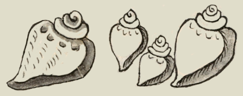 This iconographic example, featuring a group of conch shells (tecciztli), is included in this digital collection for the purpose of making comparisons with related hieroglyphs. The term selected for this example comes from the text near the image in the Digital Florentine Codex. There is no gloss, per se. This example shows different types of conch shells (tecciztli, both large and small, and a tlapaltecciztli, rose-colored or brown). The contextualizing image also shows a clam shell (atzcalli or ayopalli) and a scallop shell (tapachtli).