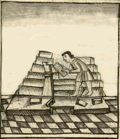 This iconographic example, featuring a black and white sketch of a man building a ruler’s palace (tecpancalli), is included in this digital collection for the purpose of making comparisons with related hieroglyphs. The term selected for this example comes from the page prior to the image in the Digital Florentine Codex. There is no gloss, per se. This example shows a Nahua man in profile, wearing a European-style belted tunic that reaches his knees. He is bent over slightly, facing left, holding a stone, that he is about to place on the building under construction. The pyramid is only about half built. The steps are shaded, giving them a three-dimensionality (a European artistic style). The foreground shows a paved floor with pieces of stone in alternating dark and light colors. At this point, the building seems little different from a teocalli (religious temple). But it would have some of its own unique features, such as carved stone and plaster, as described in the text.