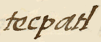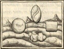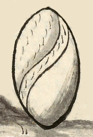 This iconographic example, featuring a black-line drawing of a flint knife (tecpatl), is included in this digital collection for the purpose of making comparisons with related hieroglyphs. The term selected for this example comes from the text near the image in the Digital Florentine Codex. There is no gloss, per se. This example shows the marquise-shaped knife with a point at the top and one at the bottom. A band of white runs diagonally, curving from nearly top to nearly bottom. This stripe has vertical short lines, or hash marks, decorating it. The top half is a light shade of gray, and has two rows of hash marks. The bottom half of the knife is white but shaded toward the bottom, giving it a three-dimensionality (showing European artistic influence). The knife is also sitting on end in a landscape setting, another European artistic influence. The curving diagonal stripe is very reminiscent of the hieroglyph for stone; this may indeed be a hieroglyph for tecpatl, in fact, although we are playing it safe and calling it an example of iconography.