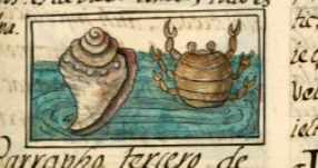 This iconographic example, featuring a crab (tecuicitli, or tecuicihtli, with the glottal stop), is included in this digital collection for the purpose of making comparisons with related hieroglyphs. The term selected for this example comes from the text near the image in the Digital Florentine Codex. There is no gloss, per se. This example shows a bird’s eye view of a crab, largely in the water. It has six legs with pincers, reaching upward. Its body is quite round and segmented with horizontal lines. Two protruding eyes (at the ends of eyestalks) are visible at the top, along with what may be some small antennae.