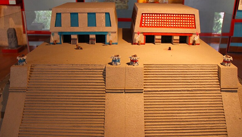 This model of the twin temples of Tenayuca, modern state of Mexico, is a photo by Comunitecnico is published in Wikimedia Commons.