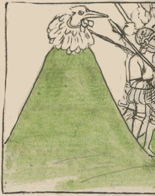 This compound hieroglyph features a black and white sketch of ritual bib made from snowy egret feathers (aztaquemitl) sitting atop a mountain (tepetl). It is included in this digital collection for the purpose of making comparisons with similar hieroglyphs. The term selected for this example comes from the text near the image in the Digital Florentine Codex. There is no gloss, per se. This example shows the head of an egret in profile, facing right. The bird is wearing a circular bib of white feathers. This bird’s head and bib are on top of a green mountain The contextualizing image shows how, below the mountain, a group of Spaniards have taken up residency for a time, probably with Cortés seated in a curule chair and other men standing.
