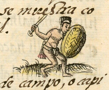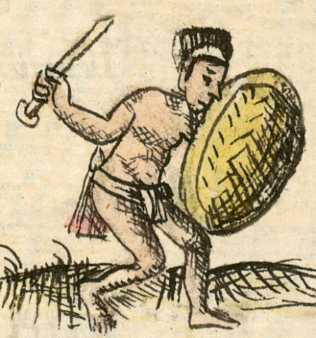 This iconographic example, featuring a warrior (tequihua, or tequihuah, with the glottal stop), is included in this digital collection for the purpose of making possible comparisons with related hieroglyphs. The term selected for this example comes from the text near the image in the Digital Florentine Codex. There is no gloss, per se This example shows a ¾ view of a warrior who is dressed only in a loincloth (maxtlatl). He is facing the viewer’s right. His pose suggests action and movement, with his legs apart and knees bend. He holds a yellow, perhaps woven, war shield (chimalli) and what looks like a sword, but might intend a macuahuitl (hand-held, obsidian blade-studded club, called a macana in Spanish). In the DFCkeywording, this warrior could also be called a yaoquizqui. The warrior seems to have a lip ornament protruding from his chin (what was called a bezote in Spanish). Finally, his head may be partially shaved, with the rest of his hair standing up something like the cuachichictli warrior hairstyle.