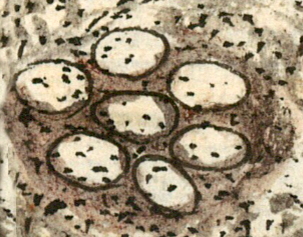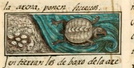 This iconographic example, featuring eggs (tetl) of the fresh water turtle, is included in this digital collection for the purpose of making comparisons with related hieroglyphs. The term selected for this example comes from the text (a possessed plural noun, iteoā, its eggs) near the image in the Digital Florentine Codex. There is no gloss, per se. This example shows seven spotted eggs on the shore of a body of fresh water. The turtle apparently made a depression in the soil or the sand, where it laid the eggs.