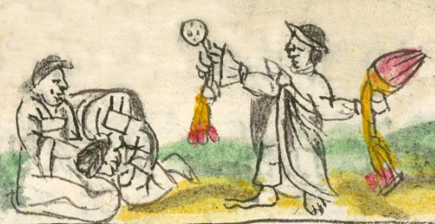 This iconographic example, featuring a buffoon (tetlahuehuetzquiti), apparently engaged in entertaining women or making them laugh (tetlahuehuetzquitia, which is the verb that actually appears in the text), is included in this digital collection for the purpose of making comparisons with related hieroglyphs. The term selected for this example comes from the text near the image on the previous page of the Digital Florentine Codex. There is no gloss, per se. This example shows a fully dressed man standing in a ¾ view, with his head in profile, facing two women, seated on the left. One woman watches the buffoon, while the other woman lends into the other’s lap. The buffoon wears a white cotton, long sleeve shirt and trousers, adopted from European clothing styles. But he has a Nahua cloak (tilmatli) of a darker color, which comes under his left arm, and then above his right shoulder, where it is tied. He also wears a bowler hat. These styles and the use of shading for three-dimensionality show European cultural influence. The man’s performance includes showing objects to the women. These are painted red and yellow. They may be an imacehualli (feather fan for dancing) and possibly a coxolitli (pheasant) feather fan, along with some unidentified objects.