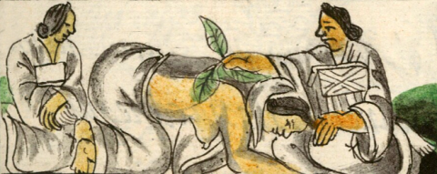 This iconographic example, featuring a punishment with stinging nettles (tetzitzicazhuia) that is being administered by a female ruler (tlatocacihuatl/tlahtocacihuatl), is included in this digital collection for the purpose of making comparisons with related hieroglyphs. The term selected for this example comes from the text on the same page as the image in the Digital Florentine Codex. There is no gloss, per se. This example shows a group of three Nahua women. Two are dressed in the huipilli blouse or tunic and a long skirt. These fabrics have shading that gives them a three-dimensionality (a European artistic style). The woman in the middle is partially undressed, and the woman on the right (the tlatocacihuatl, or ruling woman) is rubbing stinging nettle (tzitzicaztli) leaves on her bare back. The text explains that the good tlatocacihuatl is a “corrector, a punisher, a chastiser, a reprimander,” who keeps order with a firm hand. Without reviewing the text, one might think this was a healing ceremony. But the punishment involving nettles was a common one. The contextualizing image shows the ruling woman in a completely different light. She is sitting pointing (mapilhuia, or mahpilhuia, with the added glottal stop) with her left index finger at what seems to be a mountain with a cave or crater. The side of the mountain nearest her has what appears to be an upright human hand forming part of the shape for the cave or crater. The other woman, with whom the tlatocacihuatl is communicating, has her eyes closed and a hand up to one eye, as though perhaps wiping away a tear.