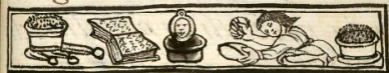 This compound hieroglyph refers to the powder made from grinding up polished obsidian stones that were used for mirrors (tezcatlalli). The compound includes two elements. At the top is a mirror with a loop at the top for hanging and a frontal view of a human (male) face. The mirror also appears to have a frame around it. Below the mirror is a bowl of what must be the powder or sand that was made from grinding the mirror stone. The bowl is three-dimensional, suggesting European artistic influence. The label for this glyph comes from the text near the image in the Digital Florentine Codex. It is shown in a group of signs, not really a hieroglyphic text, referring to various items mentioned in the text, including a book, among other things.