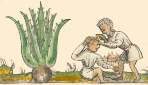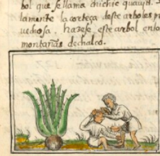 This iconographic example, featuring a physician (ticitl or tepatiani/tepahtiani), is included in this digital collection for the purpose of making comparisons with related hieroglyphs. The term selected for this example comes from the keywording in the Digital Florentine Codex. There is no gloss. This example shows two men wearing white, cotton, belted, tunics with long sleeves. They have no trousers and no shoes. The clothing is shaded, giving it a three dimensionality (showing European artistic influence). One man, the patient, is sitting on the ground. The physician or healer is laying his hands on the head of the person that is sick. Nearby is a large maguey (metl) plant, and apparently the medicine being used in this scene comes from the maguey. Between the two men is a flat bowl sitting on three hearth stones, with flames coming up around the bowl. This small fire was probably used for heating or cooking the medicine. The text near this image discusses the recipe for making a white octli (pulque) from the maguey and how to administer it. It is important to note that, while this ticitl is a male, on folio 170r shows a female healer administering metl medicine to a woman.