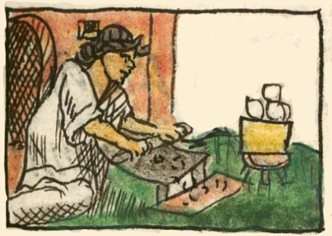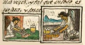 This iconographic example, featuring a cook (tlacualchiuhqui), is included in this digital collection for the purpose of making comparisons with related hieroglyphs. The term selected for this example comes from the page previous to the page with the image in the Digital Florentine Codex. There is no gloss, per se. This example shows a woman in one of her traditional occupations, to prepare food (tlacualli or neucayotl). Here, she is grinding dried maize kernels (tlaolli) to make corn dough for tortillas (tlaxcalli), tamales (tamalli), and the like. The basket (chiquihuitl) on a stool probably contains tamales. She grinds the kernels with a hand-held stone (metlapilli) on a large, sloping grinding stone (metlatl). As with so many of her labors, whether cooking or weaving, she is kneeling (verb: motlancuaquetza). She wears a white cotton tunic (huipilli) and skirt (cueitl), which is shaded by the artist here for a three-dimensional effect (showing European artistic influences). Her hair is in the traditional style (neaxtlahualli or axtlacuilli) of an adult woman, with the points above the forehead.