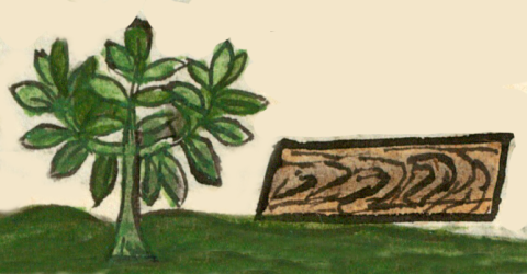 This iconographic example, featuring a rosewood tree and wooden plank (tlacuilolcuahuitl), is included in this digital collection for the purpose of making comparisons with related hieroglyphs. The term selected for this example comes from the text near the image in the Digital Florentine Codex. There is no gloss, per se. This example shows a frontal view of a tree with a leader and two branches, all of which have large green leaves. To the viewer’s right of the tree is a rectangular piece of wood, brown with curving black lines that almost look like volutes, highlighting the grain. The text describes the wood as having the look of having been painted or having writing on it. The image itself is practically a compound hieroglyph with two elements, but the wood and the tree are both cuahuitl. Still, the plank has what appears to be writing or painting on it (tlacuilolli). Perhaps this contains a remnant of the earlier hieroglyphic writing system. The tree stands in a landscape setting. This setting, along with the shading that provides a three-dimensionality to the scene, reveal European artistic influence.