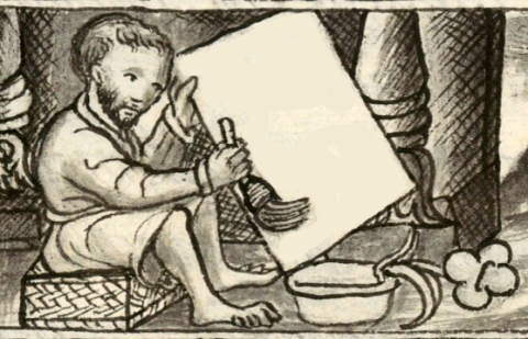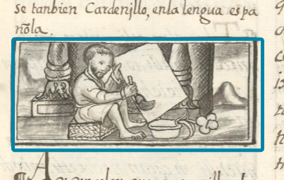 This iconographic example, featuring a person in the act of applying color to a painting (tlacuiloliztli), is included in this digital collection for the purpose of making comparisons with related hieroglyphs. The term selected for this example comes from what appears in the image in the Digital Florentine Codex. There is no gloss or text that explains the illustration. This example shows a man with a large white rectangle in front of him, and he holds a brush that he has just started using to paint. He is shown in profile, facing left, but his face is turned toward the viewer in a ¾ view. He wears a long-sleeved, belted, probably white, cotton, tunic, in a style that suggests European influence, as does the shading on his clothing. He has short hair on his head and a short black beard, possibly suggesting he is a mestizo (having both Spanish and Nahua heritage). He appears to have just started making a painting, as the brush appears to move on the paper or canvas. This brush is unique among all the hieroglyphs in this digital collection that show Nahua tlacuilos writing or painting. The normal instrument has the same shape as a digging stick (huictli), but small enough to hold in one hand. This one here is clearly a paintbrush, possibly of the type that the colonizers would have introduced. The man appears poised to paint the matlalin flower in front of him.
