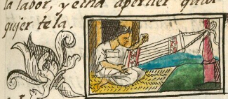 This iconographic example, featuring a weaver and embroiderer (tlamachchiuhqui) working at her backstrap loom, is included in this digital collection for the purpose of making comparisons with related hieroglyphs. The term selected for this example comes from the text on the previous page to the image in the Digital Florentine Codex. There is no gloss, per se. This example is a colorful painting of a kneeling woman on a woven mat (petlatl) working on some designs (perhaps tlacuilolli) on a piece of fabric she is weaving. This fabric is attached to the backstrap loom. The loom is tied to a red, European-style post. The belt that should go behind her back is not visible.