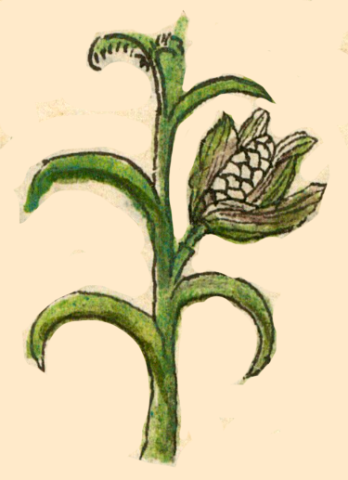 This iconographic example, featuring a maize plant (tlaolli), is included in this digital collection for the purpose of making comparisons with related hieroglyphs. The term selected for this example comes from the text on the page preceding this image in the Digital Florentine Codex. There is no gloss, per se. This example shows a frontal view of a standing corn plant with four leaf blades and a fully developed ear or cob of corn. The husk has been peeled back to show the cob and its kernels. At the top of the plant are two curling tassels that are the plant’s flowers.