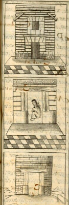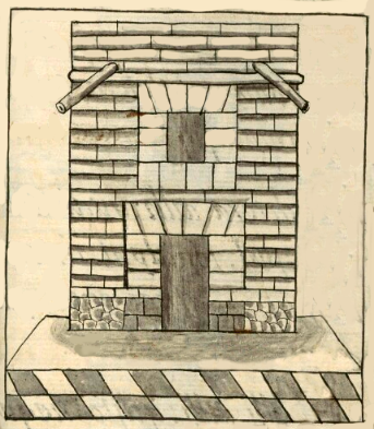 This iconographic example, featuring a black and white sketch of a house with a terrace (tlapancalli), is included in this digital collection for the purpose of making comparisons with related hieroglyphs. The term selected for this example comes from the text near the image in the Digital Florentine Codex. There is no gloss, per se. This example shows what appears to be a tall house, possibly two stories, given the window above the front door. Added to that is perhaps a terrace with a half wall on the roof. Diagonal support beams on right and left seem to support the added structure on the roof. These beams are round and protrude. The building has dark and light alternating paving stones in front, along with a small, smooth patio for accessing the front door. The door may be open; if so, the interior is dark. This is true, too, of the window. The companion text refers to this house as open and cold, which could be a reference to these openings or a comment on the rooftop terrace. The door and window appear to be reinforced with stones surrounding their openings. The facade of the house appears to be covered with adobe bricks or rectangular stones, but the explanatory text refers to a wooden covering. At the very base there appears to be some mosaic of smaller stones. Shading in front of the house and inside the openings adds a three-dimensionality to the sketch, something probably learned from colonial art teachers.