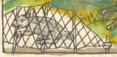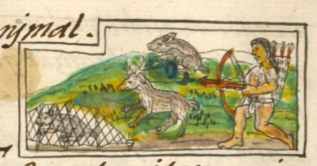 This iconographic example, featuring an animal in a trap (tlapehualli), is included in this digital collection for the purpose of making comparisons with related hieroglyphs. The term selected for this example comes from a search in the Online Nahuatl Dictionary (OND) for a term equivalent to a hunting trap. The keyword chosen by the team behind the Digital Florentine Codex for what appears in this image is tochmatlatl (which is literally a rabbit net, and refers to a trap). There is no gloss and no explanation about this type of hunting on or near the page with the image. Tzonhuaztli is another term in the OND that refers to a trap for hunting animals. This example does indeed show a rabbit trapped in a net with many stakes. The net is also tied to a stake that is anchored in the ground. The contextualizing image shows that a hunter with a bow and arrow is running toward the trapped animal, while a deer and another rabbit flee nearby.