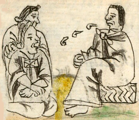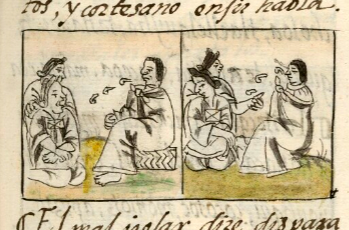 This iconographic example, featuring a storyteller (tlaquetzqui), is included in this digital collection for the purpose of making comparisons with related hieroglyphs. The term selected for this example comes from the text near the image in the Digital Florentine Codex. There is no gloss, per se. This example shows a fully clothed man seated on a low woven seat (icpalli). He wears a large cloak (tilmatli), probably over a Spanish-style shirt and trousers, but the latter are not visible.The cloak is tied in front over his chest. His clothing is shaded in places to give it a three-dimensionality, evidence of European artistic influences. Three volutes or speech scrolls emerge from his mouth in the direction of the two women who are listening. They are dressed traditionally with huipiles and nahuas (also three-dimensional), and their hairstyle is the neaxtlahualli or axtlacuilli, the traditional way for adult women to wear their hair, with two points above the forehead. One of the women seems especially engaged with the story. The text describes the storyteller with great praise, as though this practice was highly revered.