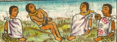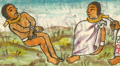 This iconographic example, featuring two enslaved people (tlacotli, singular, tlatlacoti or perhaps tlatlacotin, plural) and their merchant owners, in a moment prior to the execution of the captives, is included in this digital collection for the purpose of making comparisons with related hieroglyphs. The term selected for this example comes from the text near the image in the Digital Florentine Codex. There is no gloss, per se. This example shows one enslaved person in a ¾ view, semi-reclined, naked except for his loincloth, the wooden yoke around his neck, and the handcuffs that encircle his crossed wrists. The other enslaved person wears a white cloak (so from a somewhat higher social status) tied over his left shoulder. The folds in the fabric are painted purple, showing folds and a three-dimensionality. This man has the same type of yoke on his neck, but this one has a rope tied to it, and the rope is being held in the hand of one of the merchants, restraining the ill-fated person.