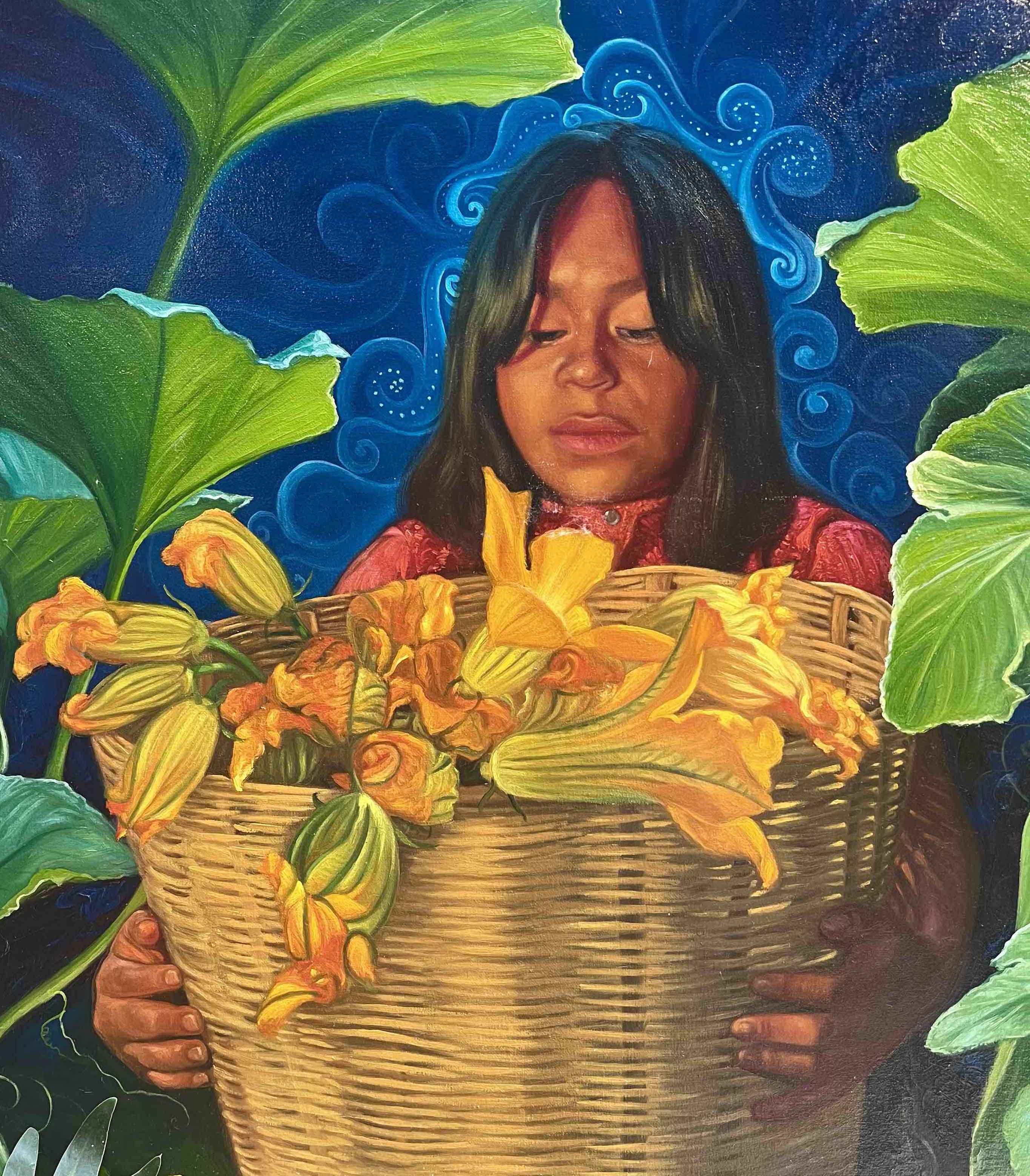 This painting in the art museum in Ajijic, Jalisco, shows yellow squash blossoms that have been harvested by a girl. Photo by S. Wood, 17 June 2025.