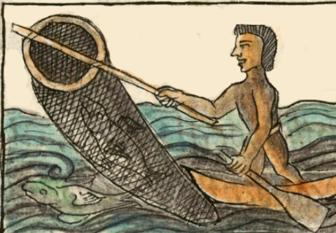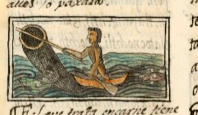 This iconographic example, featuring the verb “to fish” (tlatlama), is included in this digital collection for the purpose of making comparisons with related hieroglyphs. The term selected for this example comes from the text on the page preceding (58r) the image the Digital Florentine Codex. There is no gloss, per se. This example shows a man in profile, wearing only a loincloth, standing in a canoe, facing toward the viewer’s left. In his left hand he holds a paddle, and in his right hand he holds onto the wooden handle of a large net attached to a hoop. A large fish is visible in the net. The net is at least as long as the man is tall.