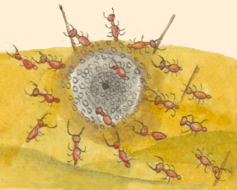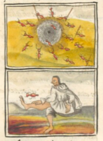 The Codex Mendoza does put a red ant (azcatl) in the middle of an ant hill, surrounded by sand and small stones, but this is a place name, Azcapotzalco. Ants eggs were eaten by humans, which may be why they appear quite regularly in this collection. Interestingly, Azcatl was a common personal name for men. Red ants are especially known for biting and causing pain, but their bite is not deadly.