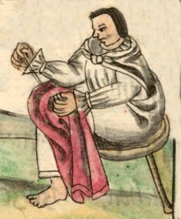 This iconographic example, featuring the verb “to sew” (tlatzoma, or tlahtzoma with the glottal stop), is included in this digital collection for the purpose of making comparisons with related hieroglyphs. The term selected for this example comes from the text near the image in the Digital Florentine Codex. There is no gloss, per se. This example shows a fully clothed man, a tailor, sitting on a wooden stool, with a large red piece of cloth on his lap. He punctures the cloth with a large needle. The tailor is wearing a European shirt and trousers and a Nahua elite cloak (tilmatli, or tilmahtli, with the glottal stop), tied on a shoulder, and worn over the other clothing. He is barefooted. The clothing and the red cloth all have some folds and shading that give it a three-dimensionality.