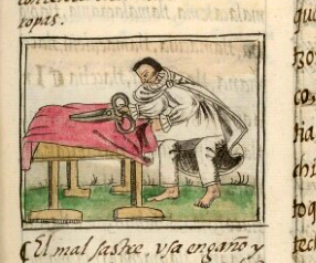 This iconographic example, featuring a tailor (tlatzonqui, or tlahtzonqui with the glottal stop), is included in this digital collection for the purpose of making comparisons with related hieroglyphs. The term selected for this example comes from the text on the same page as the image in the Digital Florentine Codex. There is no gloss, per se. This example shows a ¾ view of a fully clothed man, wearing a European shirt and trousers and a Nahua elite cloak (tilmatli/tilmahtli), tied on a shoulder, and worn over the other clothing. The clothing has shading that gives it a three-dimensionality. He is barefooted. The man leans over a wooden table with four legs. On the table is a large red piece of fabric (keyworded in the DFC as tlaquimiliuhcayotl or tetectli). The man holds the cloth with his left hand and has a pair of scissors (keyworded in the DFC as tlateco tixeras or tlatequiloni) in his right hand. He is apparently about to cut the fabric. In another image on this same page, he sits with the cloth in his lap, sewing it with a large needle. The making of clothing originally fell primarily to women, but the introduction of the European occupation of tailor represented something of a gender shift, but women continued to make most clothing for centuries to come.