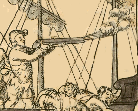 This iconographic example, featuring a black and white sketch of a Spaniard firing a lombard gun (tlequituiztli) aboard a ship, is included in this digital collection for the purpose of making comparisons with related hieroglyphs. The term selected for this example comes from the text near the image in the Digital Florentine Codex. There is no gloss, per se. This example shows a Spaniard in profile, facing the viewer’s right. He holds his weapon, what Lockhart has translated as a “lombard gun,” horizontally. Flames and smoke shoot out from it. Below the gun, Nahua messengers, who met the ship and came aboard with gifts, have fainted or swooned from the intimidating show of fire power.