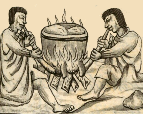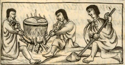 llamas, oro, leña, hombres, macehuales, flauta, flautas, pipa, pipas, aire, viento, herramientas, fuegos