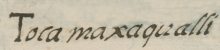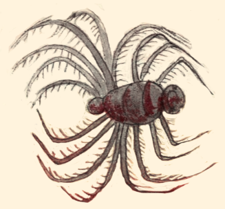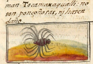 This iconographic example, features what is supposed to be a tarantula (tocamaxacualli). It is included in this digital collection for the purpose of making comparisons with related hieroglyphs. The term selected for this example comes from the text near the image in the Digital Florentine Codex. There is no gloss, per se. This supposed tarantula, which is supposed to be a large hairy spider, has 17 legs and a five-part body. The body is painted gray with reddish brown shading, giving it a three-dimensional look (which suggests European artistic influence). At least the legs are hairy. The landscape setting visible in the contextualizing image shows European artistic influences, too. Another nearby image on this same side of the folio shows a different version of the tocamaxacualli, a small bug with short legs and a body with red and white stripes.