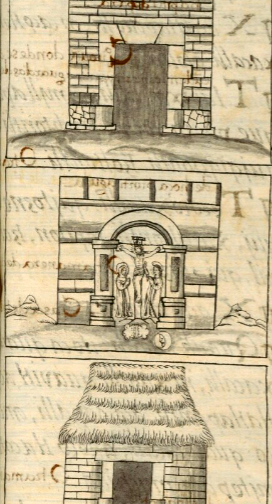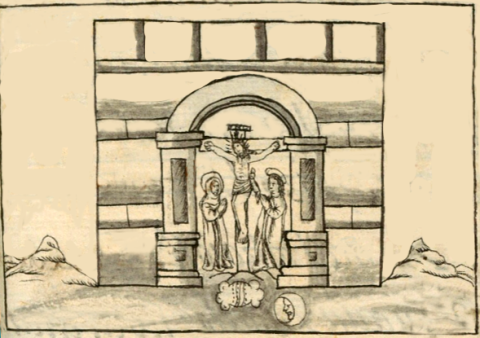 This iconographic example, featuring a chapel devoted to Jesus Christ (totecuiyo ichan), is included in this digital collection for the purpose of making comparisons with related hieroglyphs. The term selected for this example comes from the text near the image in the Digital Florentine Codex. There is no gloss, per se. This example shows a frontal view of a chapel (described in Spanish as an hermita) that has both Indigenous and European architectural characteristics. The entrance is an arch supported with columns. Inside the arch is a figure of Christ on a cross with what may be two friars. On Christ’s left is a robed man with a hood and a halo; his hands are in prayer. On the right of Christ is another robed man; this one has long hair and he has his hands in prayer, too. Other than these contents, the building looks much like a calli. This building is set in a landscape setting, which is a European artistic technique the tlacuilo must have learned from a colonial instructor. Especially interesting is the presence of two Nahuatl hieroglyphs, a stone (tetl) and a moon (metztli), on the platform just outside the chapel. These apparently refer to a place name Anderson and Dibble spell as “Temitztla,” changing the “e” to “i,” as a location of a chapel devoted to Christ; another one is said to be at Anahuac (Mexico City or somewhere on the coast?). The moon is drawn in a European manner, with a face rather than a rabbit, which was the Nahua pre-contact way.