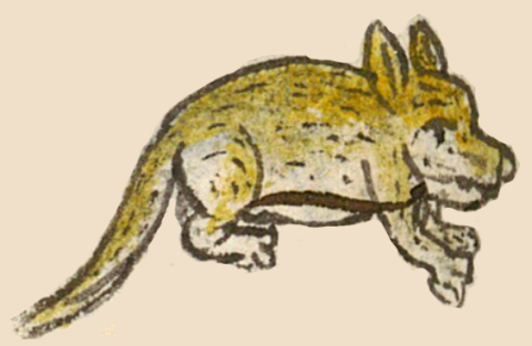 This iconographic example, featuring a gopher (tozan, also called the tuzan), is included in this digital collection for the purpose of making comparisons with related hieroglyphs. The term selected for this example comes from the Nahuatl text near the image in the Digital Florentine Codex. There is no gloss, per se. This example shows a small yellow animal with a long tail. It is shown in profile, facing the viewer’s right. Its coat is mottled, and its belly is white. From the drawing, it is difficult to tell if this is a gopher or a field mouse.