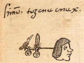 This compound Nahuatl hieroglyph is a black-line drawing of the personal name Tozcuecuex (attested here as a man’s name). The name begins with Toz- which is the starting sound for toztli, the yellow-headed parrot, which must be the bird in the compound. Likewise, the (vertical) feather alone can represent the bird. The parrot and the feather are standing on a cord to which two (possibly gold) bells are attached, hanging down. The cord with the bells represents the part of the name that is -cuecuex, which can refer to a bracelet, but more often is an anklet worn by dancers. The cord can vary between carrying beads or bells (or both), but this example would seem to be about hanging toztli feathers and golden bells around the ankle. The name Macuex refers to a bracelet with stone beads.