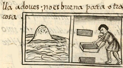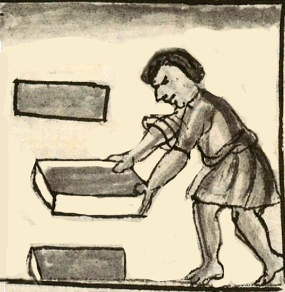 A hieroglyphic entry in this collection shows a man carrying some adobe bricks on his back. He was one of twenty men from Iztacalco who were taking material to a construction site. Another glyph, for a personal name (Xantli), shows what may be a single adobe brick.