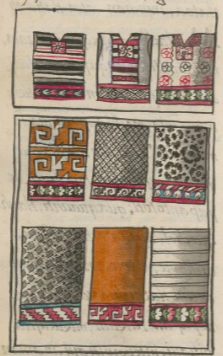 This iconographic example, featuring a piece of cloth or a skirt with a stepped fret design (xicalcoliuhqui) is included in this digital collection for the purpose of making potential comparisons with related hieroglyphs. The term selected for this example comes from the text that appears on the same page. This example shows a large rectangle that is apparently a skirt (cueitl). It has two rows across the top with the rectangular spirals that are also called stepped frets (xicalcoliuhqui). These are orange on a white background, with orange and white stripes separating these two rows. Below that is a lower border of three-petaled flowers on their sides, with white petals and green stems and leaves. The flowers are on a black background. A thin red stripe appears above and below the row of flowers. On this same page, the large blank orange cloth has another stepped fret design on its lower border, too.