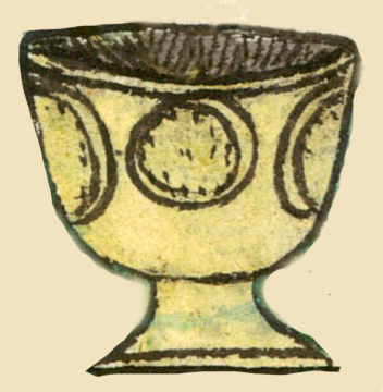 This element of a gourd-based drinking cup (xicalli), has been carved from the compound glyph of the name for a butterfly, xicalpapalotl. It features a frontal view of a cup with a stem. Three circular designs are visible on the cup. The stem has a wide base, flaring out.