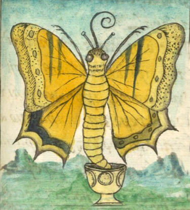 This is a compound glyph two-tailed tiger swallowtail butterfly (xicalpapalotl). It has two parts, the lower part is a xicalli, in this case a cup with a stem and three visible circular designs. This provides the phonetic start (xical-) to the name of the butterfly. The swallowtail hovers in a frontal view above the cup. Its wings are yellow, gray, and black. It has a segmented body. It has two gray eyes, two antennae, a curling proboscis, and two forelegs. This compound hieroglyph glyph is set in a landscape setting, which suggests European artistic influence. The text explains that this is a rare butterfly and much sought-after.