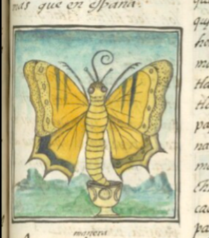 This is the first xicalpapalotl to enter this digital collection, although there are many butterflies of various kinds and two examples of Xochiquetzal. There is one yellow papalotl from the Matrícula de Huexotzinco, where most glyphs are simple black line drawings. In that case, effort was taken to add yellow paint. A quick search for papalotl will bring up more than we can fit in the “see also” field. Some of these are drawn in a profile view, and some show the butterfly with its wings spread. The curling proboscis is almost a diagnostic feature, and reflects the Nahuas’ interest in coiling and swirling things around them. While this is not a traditional compound hieroglyph, it is a late expression of that form of writing.
