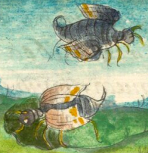 This iconographic example, featuring two bumblebees (xicotli, or xicohtli with the glottal stop), is included in this digital collection for the purpose of making comparisons with related hieroglyphs. The term selected for this example comes from the text near the image in the Digital Florentine Codex. There is no gloss, per se. This example shows two bees, one in a bird’s eye view on the ground, and the other in flight (showing movement). Their gray bodies appear segmented, and their tails come to a point that curves. Their wings have a yellow and pink design. The landscape setting for these bees suggests European artistic influence.