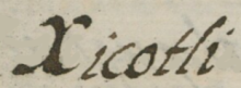 The xicotli makes several appearances in this digital collection, often as a personal name, “Xico.” A few are shown below. The bumble bee is also present in the compound glyphs for the place name, Xicochimalco, and the name of a famous person, Xicotencatl. A Quick Search for xicotli will bring all these results.