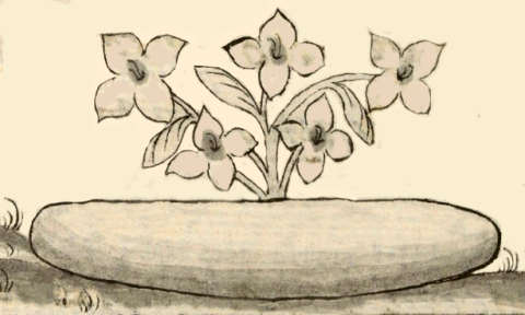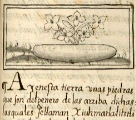 This iconographic example, featuring a black-line drawing of a highly prized gem, perhaps a sapphire (xiuhmatlalitztli), is included in this digital collection for the purpose of making comparisons with related hieroglyphs. The term selected for this example comes from the text near the image in the Digital Florentine Codex. There is no gloss, per se. This example shows a stone that resembles a large potato, but long and somewhat flat. Above the stone is a group of five flowers, each one on its own stem, and each one with four petals. Some stems have a single leaf. The nearby text explains that this is the most highly-prized gem of all precious stones, and it might be a sapphire. The name combines turquoise (xihuitl), a blue-green colored flower (matlalin), and obsidian (itztli). While this record designates the image as an example of iconography, the compound nature of this image of the xiuhmatlalitztli might deserve to be reclassified as a hieroglyph. Since there is no color added to the flowers, this image will not help settle the question about whether matlalin is a blue, blue-green, or green. Please note that the flowers should be lighter in color than shown here, because the paper got aged and the flowers have not been retouched the same way we lightened the background. It is also important to recognize that the landscape setting suggests European artistic influences.