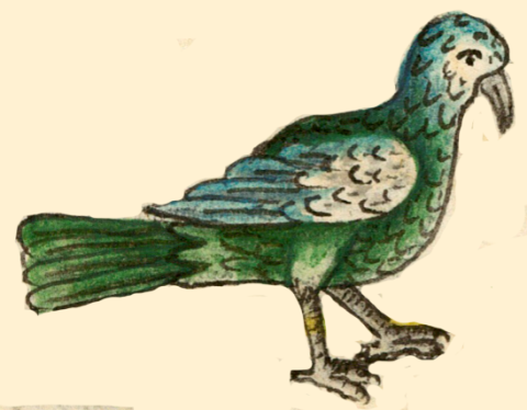 This iconographic example, featuring a Mexican motmot bird (the xiuhquechol) with blue and green feathers, is included in this digital collection for the purpose of making comparisons with related hieroglyphs. The term selected for this example comes from the Nahuatl text on the same page as the image in the Digital Florentine Codex. There is no gloss, per se. This example shows the bird standing and facing the viewer’s right. One foot is in front of the other, which may mean it is walking. It is placed in a landscape setting, which shows European artistic influence.