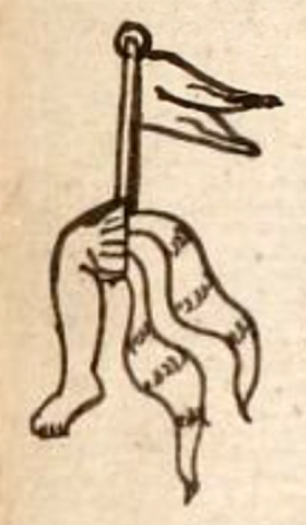 This compound Nahuatl hieroglyph is a black-line drawing of the personal name Xopan (“Growing Season”), attested here as a man’s name. The compound has two elements. One is a partial leg with a foot, providing the phonetic syllable at the start of the name (Xo-). The other is a flag (pamitl, as spelled in the northern and eastern flanks of the Valley of Mexico), which provides the phonetic syllable -pan at the end of the name. The flag appears to have two streamers hanging down from the bottom of the flag staff.