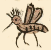 This black and white painting of the simplex glyph for the personal name Zayol (from zayolin, referring to a "Fly") is attested here as a man's name. The fly is shown in profile, facing toward the viewer’s right, but it is not flying horizontally. Its head is upward, and its legs and feet are stretched out in front of the bee. Its wings are therefore on the left. They have a hatched or mesh pattern that could suggest transparency.